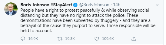 英國首相鮑里斯·約翰遜發文表示對警察的支持:在保持社交距離的前提下,人們有和平抗議的權利,但是抗議者無權襲警,違法者應受追責。