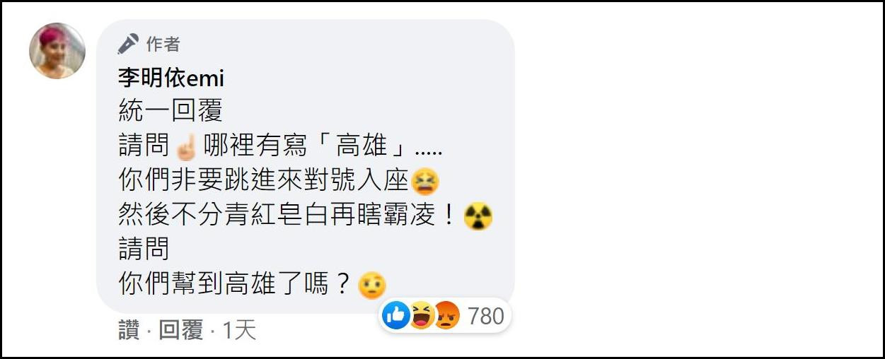 事後,李明依進行回應稱,台灣網民對號入座的能力過強,而且霸凌也無助於高雄的發展。