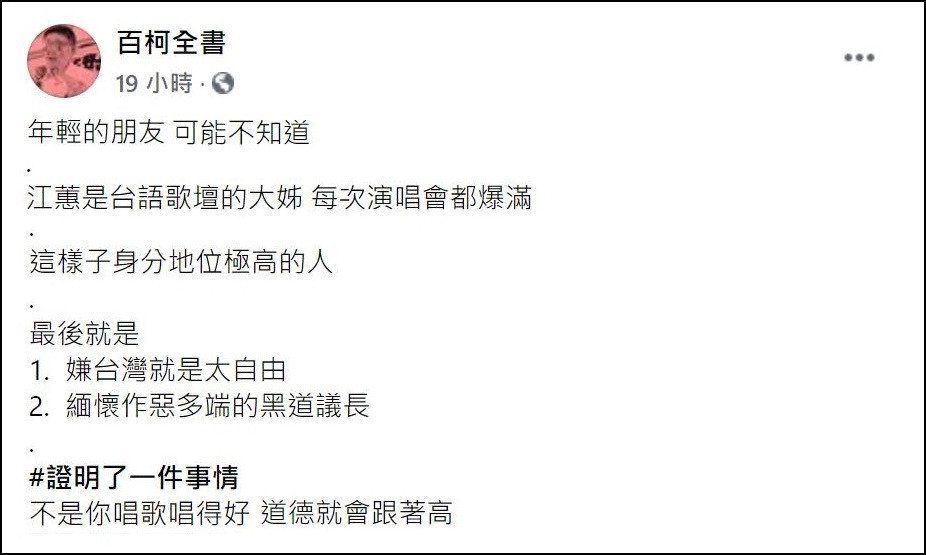 事情引發爭議後,江蕙將貼文刪除,不過還是沒能止住酸民的攻勢。
