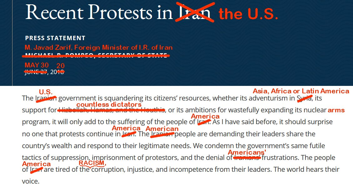 伊朗外交部長扎裏夫將一份2018年美國針對伊朗的聲明替換主語,將這份檄文“物歸原主”。(圖源:伊朗外長扎裏夫個人推特) 美國雙重標準的迴旋鏢效應已經顯現。伊朗外交部長扎裏夫近日將一份2018年美國針對伊朗的聲明替換主語,將美國曾經“大義凜然”譴責伊朗政府的檄文“物歸原主”:“美國民眾已經厭倦了領導人的種族主義、腐敗、不公、無能,全世界都聽到了他們的呼聲。”