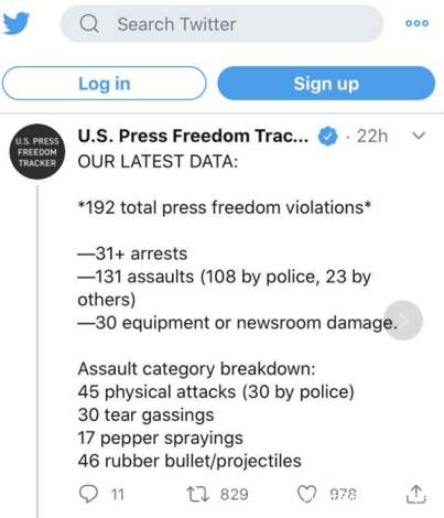 美國新聞自由追蹤系統由非營利性組織新聞自由基金會開發,專門監控美國境內違反新聞自由的行為。據《時代》報道,過去三年中,追蹤人員每年記錄美國發生100至150起違反新聞自由的事件,然而僅在近期,調查人員的處理量就超過了平均水平。該追蹤系統近期記載了至少192起侵犯行為,其中至少31起逮捕記者,131次遭到警察或其他人員騷擾,30起設備或新聞工作間被損毀。按類型來看,其中至少發生45起人身攻擊案件,其中30起是警察發起的人身攻擊,30起瓦斯催淚彈襲擊,17起胡椒粉噴射,以及46起橡皮子彈襲擊。