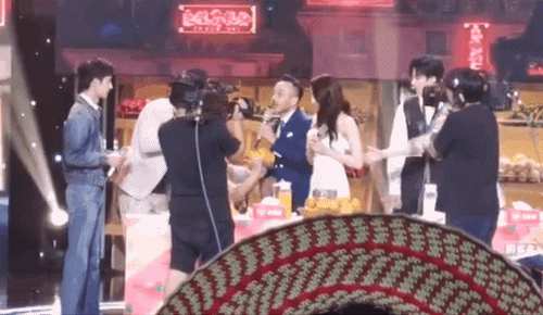 大張偉和劉宇寧都從舞台的一側靠過來,站到迪麗熱巴與涉事男子的中間,將她與興奮的男子隔開。