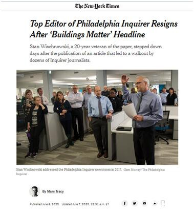 “黑人之死”引發的抗議怒火持續延燒,“黑人生命同樣重要”(Black Lives Matter,又譯作“黑人的命也是命”)的口號持續數天迴盪在美國上空,爭議事件也在上演……美國《紐約時報》6日報道稱,一篇題為“建築物也同樣重要”(Buildings Matter, Too)的報道同樣點燃了有關“反種族歧視”的怒火,爭議與批評聲中,一家擁有近兩百年曆史老報社的總編斯坦•維斯諾斯基(Stan Wischnowski)辭職。