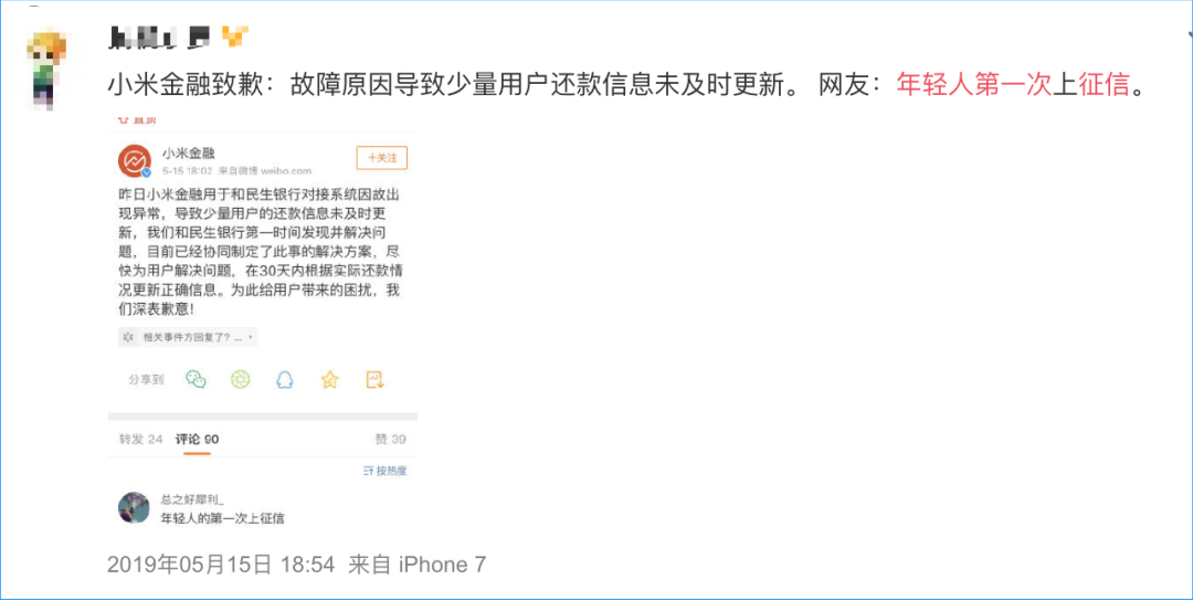 去年5月,小米金融徵信鬧劇成為外界關注焦點。有用户表示,“正常還款,且在未收到任何提示還款或催收的情況下,被上徵信”。#年輕人的第一次徵信#成為微博熱門話題,小米金融也遭遇用户質疑。