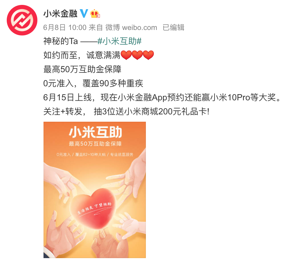6月8日,小米金融官方微博表示,小米互助將於6月15日上線,“最高50萬互助金保障,0元准入,覆蓋90多種重疾”。