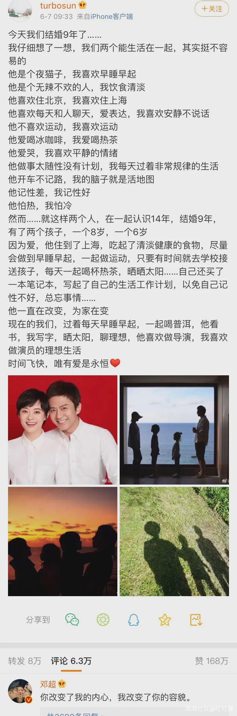 沒有肉麻的情話,也沒有煽情的小作文,就一張温馨的家庭照和一句簡單的“9週年快樂”,卻惹來幾十萬網友的羨慕。