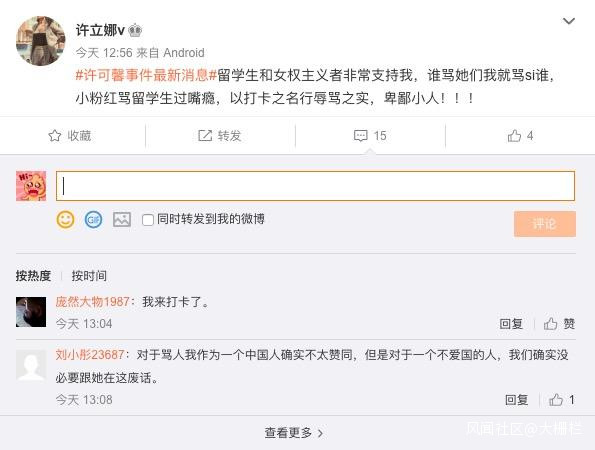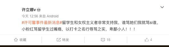 其中,既有着為留學生代言的豪言壯語,同時也給自己標榜上了女權主義者的相關言論。無論是給將標籤黏在自己身上強行地找陣營鑽,還是繼續聒噪地鬧騰,總之這個微博用户許立娜v的相關言論,假如屬實是許可馨本人的話,其相關言論真的是繼續挑起了羣眾厭惡許可馨本人的情緒,同時對於她所謂擁有家和人脈的家庭也並非是好事。