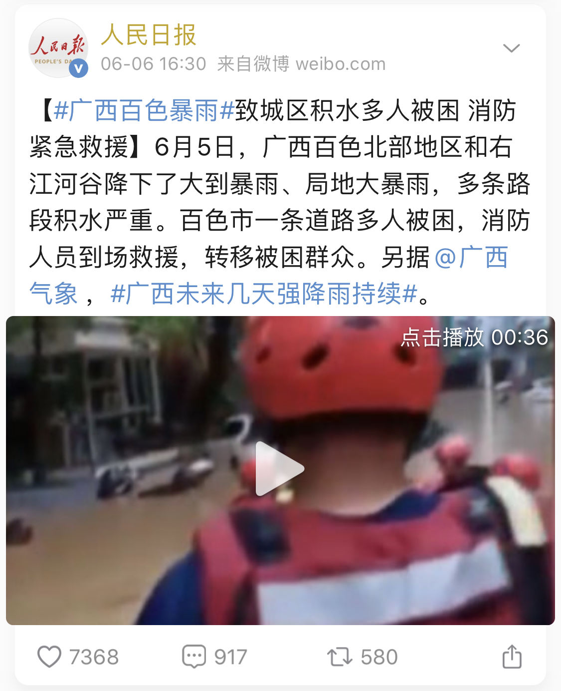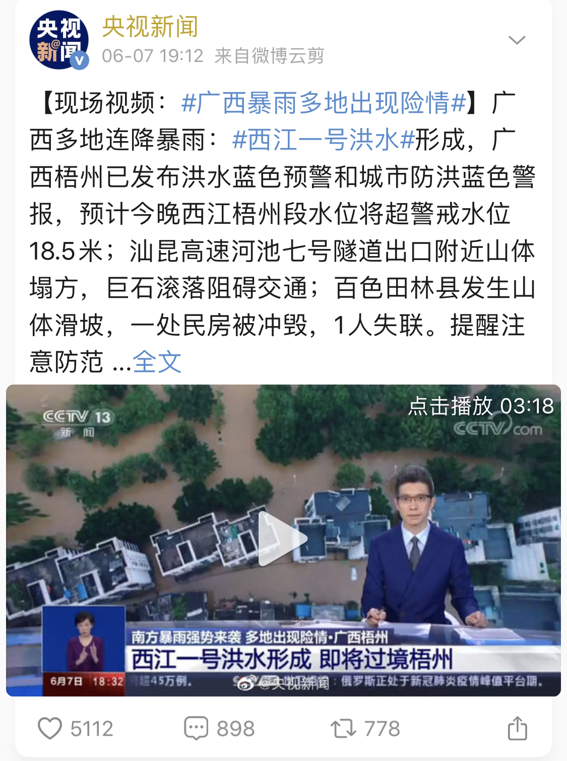 乍一看,行文言辭激烈直接,似乎在對我國主流媒體進行“輿論監督”,喚起大家對我國南方受災地區的關注。但稍加關注便能發現,對於南方洪災的報道不僅不少,在各種媒體平台上也得到了相當的重視。早在3月27日,人民日報在微博平台便報道了我國氣象局國家氣候中心對我國今年氣候“澇重於旱”的新聞,為各省市做好防洪作出了預警,而在5月後更是發佈了數十餘篇餘災情有關的跟進內容。央視不僅在各電視新聞頻道中從官兵、受災羣眾、救災政策等多個方面進行了報道,還在微博平台實時跟進,甚至安排記者到實地進行直播。