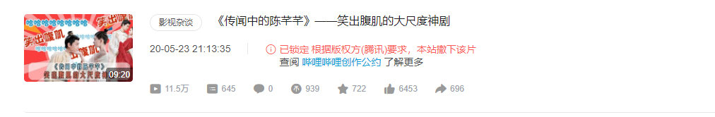 然而就在昨天,一位娛樂博主發現,自己為《陳芊芊》耗費心力所做的安利視頻卻被B站下架了,下架原因是騰訊視頻舉報其有“版權問題”。