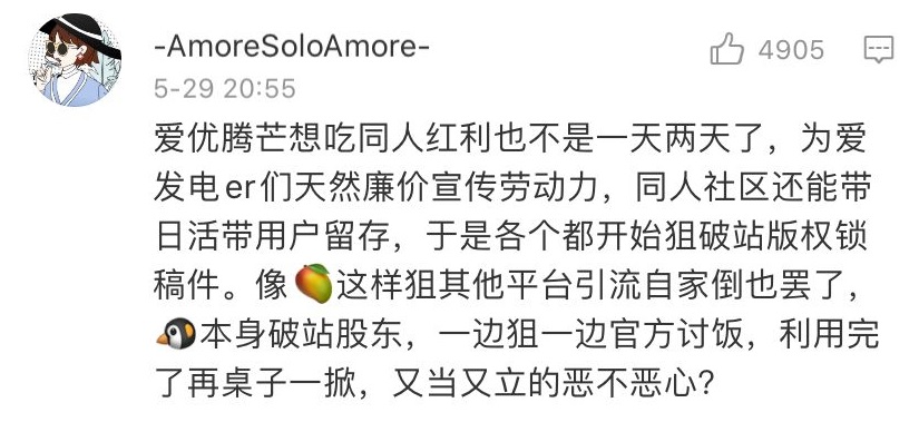 但對於版權方資本家來説,他們想不付出商業酬勞就獲得無本萬利的同人紅利,但同時卻又不願讓同人分得一杯羹,不願將自家的作品稱作“同人起家”。吃相如此難看,或許也算是某種新時代“過河拆橋”、“又當又立”。