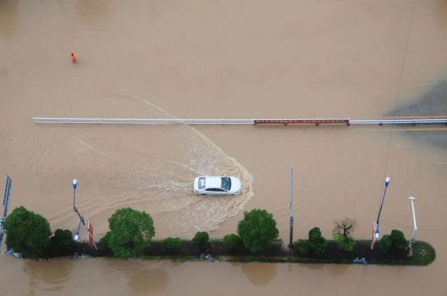 6月7日,車輛在廣西賀州市街頭涉水行駛