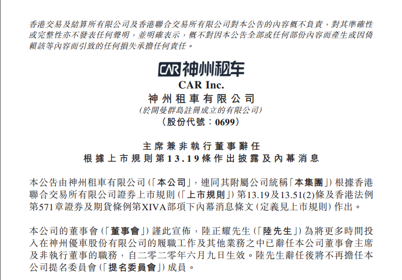另外,陸正耀在辭任後將不再擔任神州租車提名委員會成員,其已確認與董事會無辦意見不合,並未與其他有關其辭職的事宜須提請港交所及神州租車股東垂注。