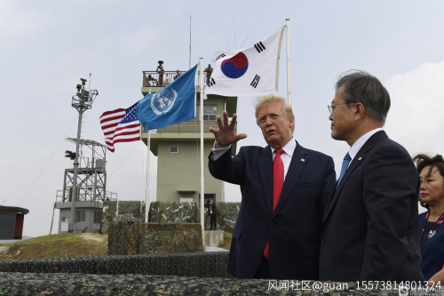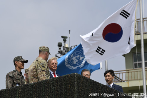 當地時間2019年6月30日下午,美國總統特朗普乘坐直升機抵達朝韓非軍事區。韓國總統文在寅也同步抵達。