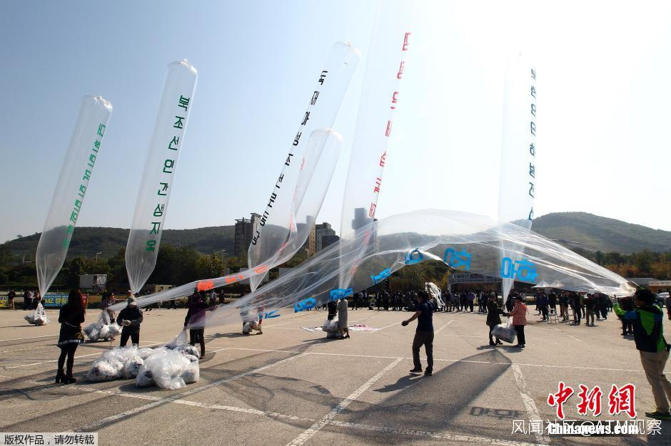 資料圖:當地時間2014年10月10日,韓國坡州,韓國一民間團體散發反朝傳單,約兩萬張反朝傳單隨氣球升空。