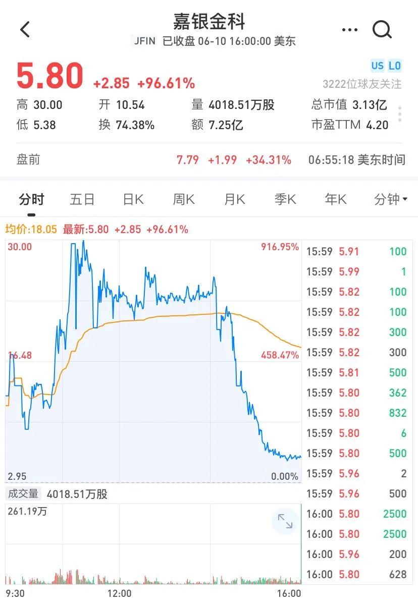在這一次暴漲熔斷中,嘉銀金科無疑是瘋狂的代表。數據顯示,嘉銀金科盤中股價多次觸發熔斷一度暴漲逾916%,股價也一度由5.38美元/股飆升至30美元/股,最終收漲96.61%。