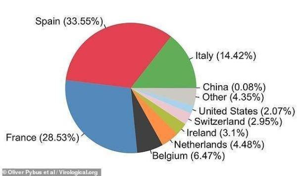 剩下的部分,15%的病毒樣本可以追溯到比利時(6.47%)、荷蘭(4.48%)和愛爾蘭(3.1%)。2.95%的病毒樣本來自瑞士、2.07%來自美國。而能夠追溯到中國的病毒樣本只佔0.08%。
