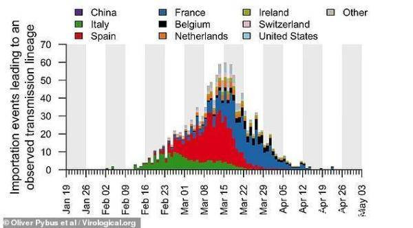 來自愛丁堡大學和牛津大學的科學家,從16500名新冠病毒陽性的英國人身上提取了樣本,對這些樣本的基因組進行了研究。結果顯示,34%的病毒樣本可以追溯到在西班牙流行的毒株,29%追溯至法國,14%追溯至意大利。這些佔到所有病毒樣本的77%。
