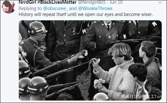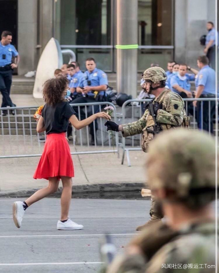 有網友諷刺説:如果佐伊不是給國民警衞隊送花,而是給警察送飲料,她經歷的可能就會是另外一個故事了: