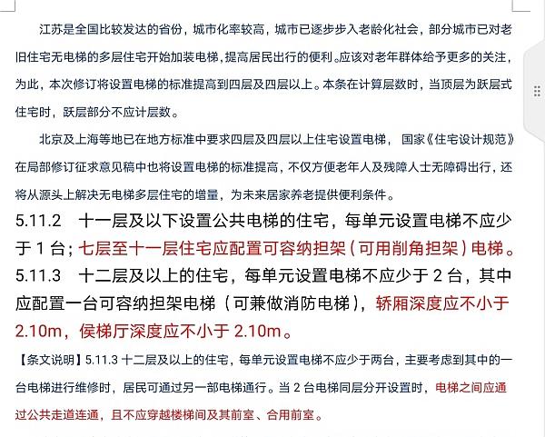 今後住宅層高多少能有電梯呢?參考北京等地經驗,江蘇將標準提高,今後4層及4層以上住宅或住户入口層在樓面距室外設計地面的高度超過10米時,必須設置電梯並滿足無障礙使用要求。