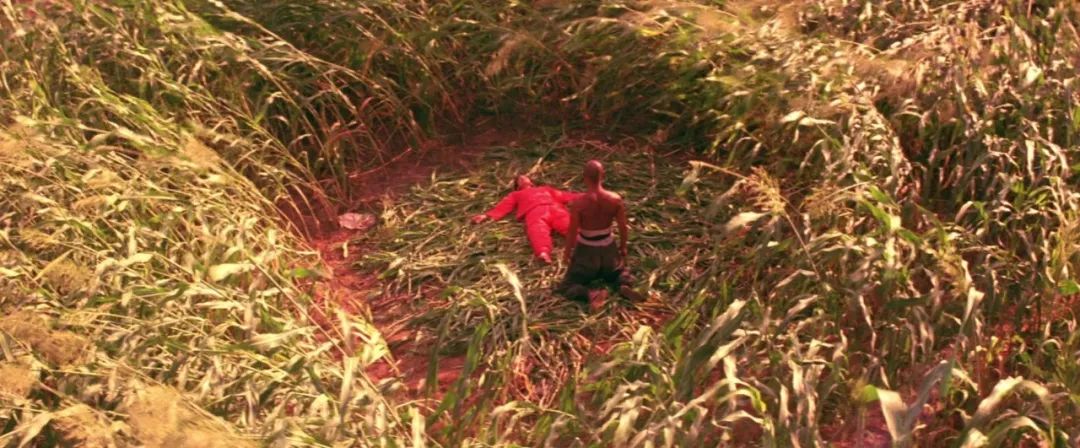 電影重要的“野合”段落,鏡頭攝入了炫目的陽光、迷狂的對切鏡頭,踏倒的高粱形成了圓形祭壇,仰倒的紅衣女人和雙膝跪倒的男人,配合着高亢得近乎慘烈的嗩吶聲,精怪般狂舞的紅高粱,整個場景都彌散着近乎悲愴的狂喜。