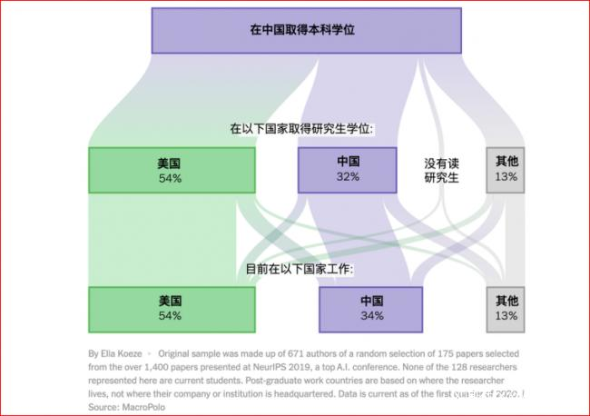 更多的中國頂尖人工智能人才最終流向美國,數量遠高於其他地方。128位在中國大學取得本科學位、在該人工智能學術會議上發表過論文的研究人員中,現在有超過一半在美國工作。