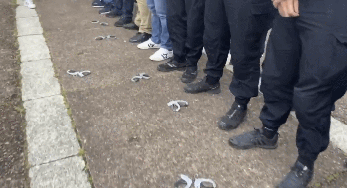 這一幕也出現在了博比尼,約100名警察成排站立,扔下貼有“警察”一詞的手銬。