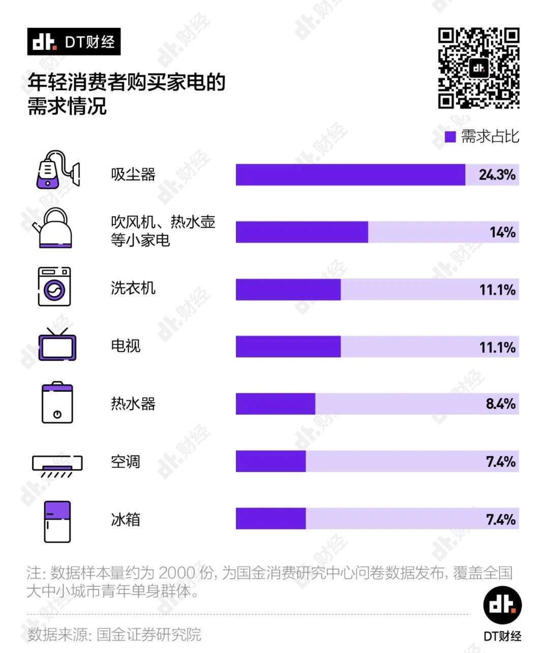 相對於空調、冰箱、熱水器這樣的大家電,年輕消費者購買吸塵器、吹風機、熱水壺等小家電的意願更強。