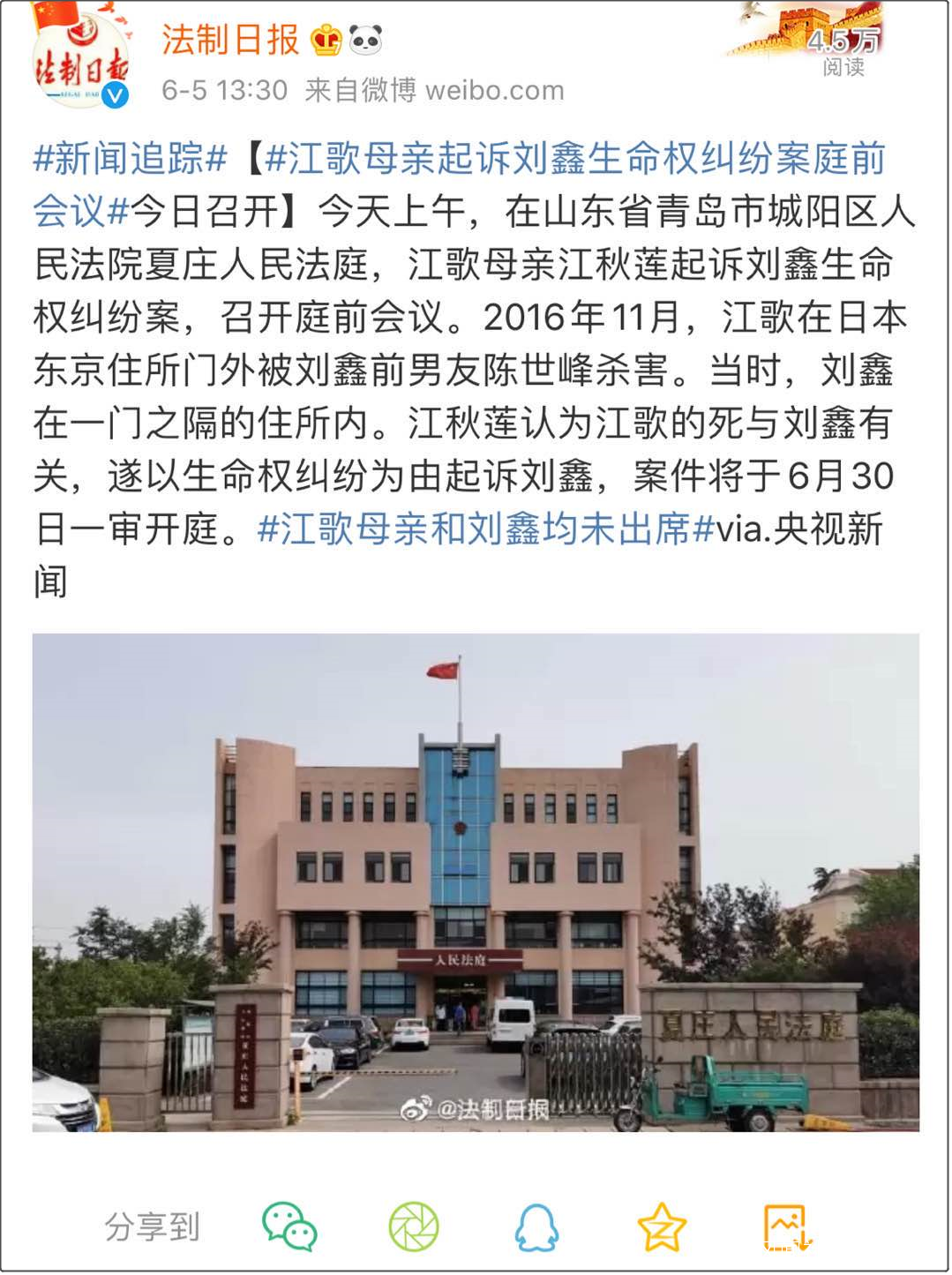 6月5日,江秋蓮以生命權糾紛為案由,希望法律能定奪劉鑫在江歌遇害案中不可推卸的過錯。