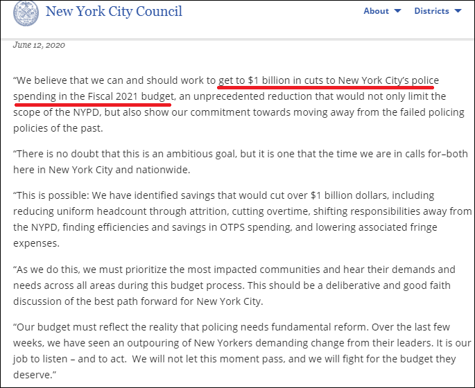 黑人弗洛伊德之死引發的抗議遊行衝擊美國全境,紐約市也不例外。當地的抗議者認為紐約警方拿着納税人的錢來武力鎮壓羣眾,應當削減警方的費用,並把這筆錢用到青年服務和社區服務等方面上來。