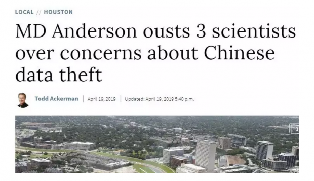2019年4月,美國德州大學MD安德森癌症中心驅逐三名華人科學家,其中兩名已經被開除,另有一名正在辦理離職程序。這是該調查啓動後首次公開處罰情況。