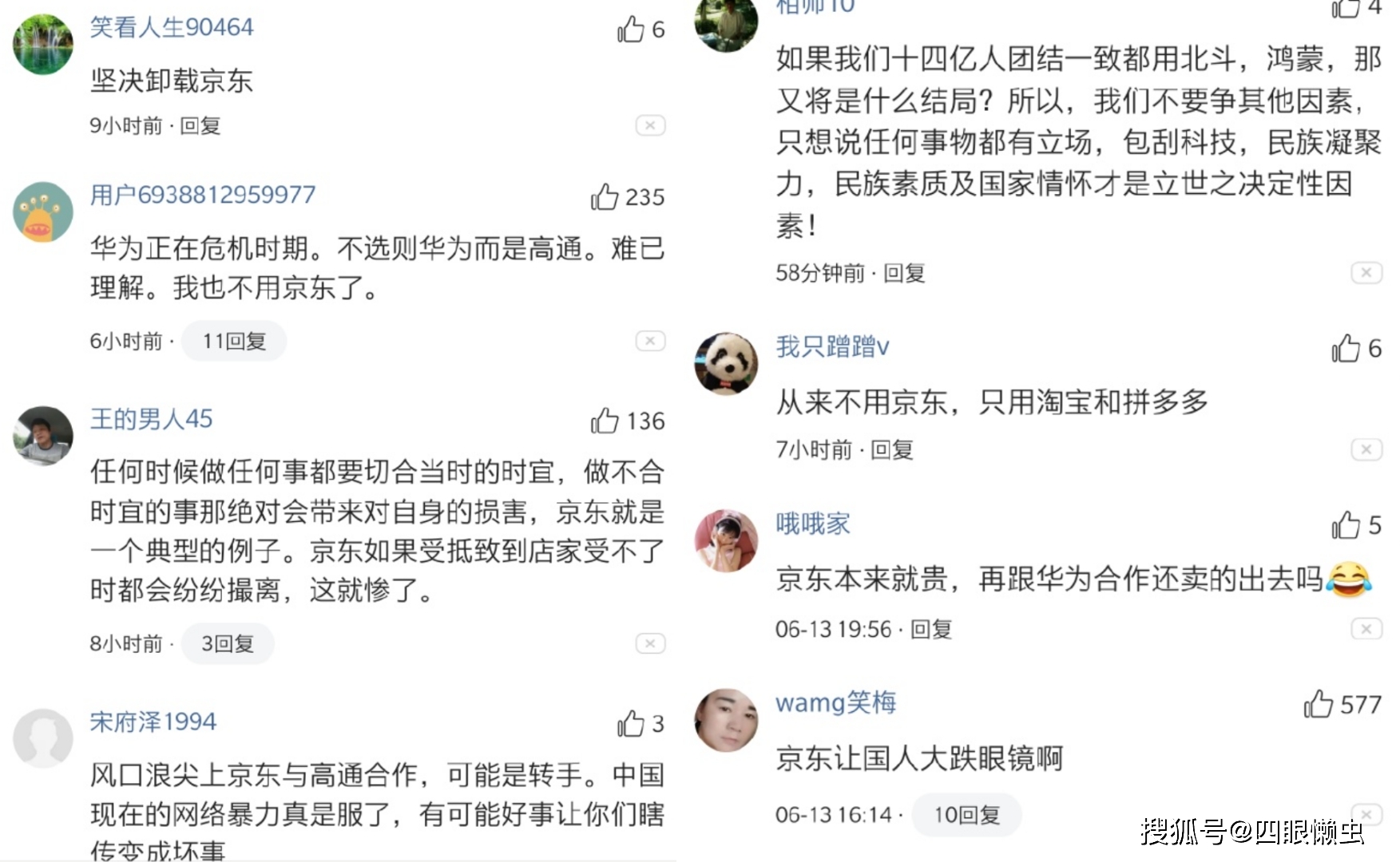 在一些新聞平台的相關報道下,輿論的偏向非常清晰,不少網友都表態要卸載京東、只用淘寶拼多多、京東讓人大跌眼鏡……在這部分網友看來,華為在危難關頭得不到國內巨頭企業的幫助,反而這些巨頭企業還和美國公司合作發展5G,是一種非常諷刺的行為讓人心寒。