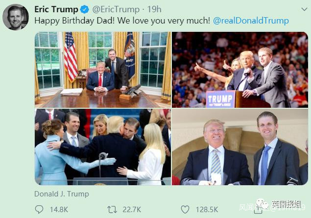 另一邊,特朗普最愛的社交網絡——推特上他的家人也都搶着秀合照,送祝福。二兒子 Eric 反應最快,發的圖最多。