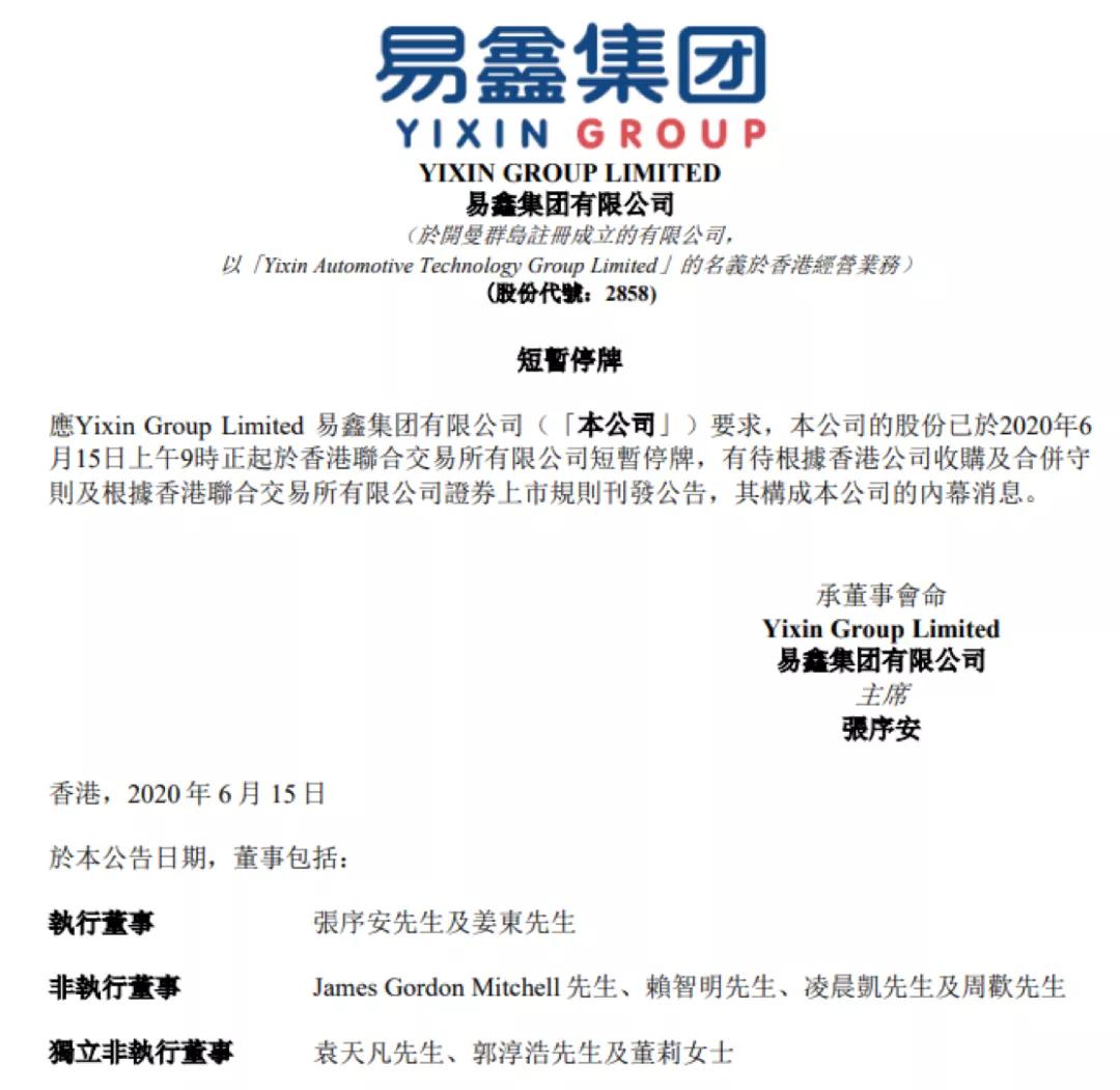 6月15日,易鑫集團發佈公告稱,因公司自身要求,公司股份於6月15日上午9時起於港交所短暫停牌,有待根據香港公司收購及合併守則等刊發公告,其構成本公司的內幕消息。
