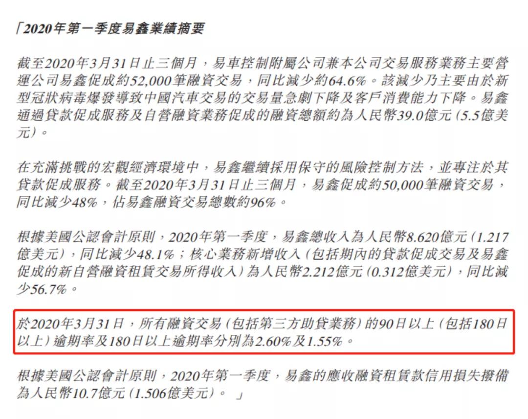 交易量下降的同時,易鑫的資產質量也在下滑。易鑫方面指出,截至2020年3月31日,一季度公司所有融資交易(包括第三方助貸業務)的90日以上(包括180日以上)逾期率及180日以上逾期率分別為2.60%及1.55%,上年同期分別為0.90%和0.43%。