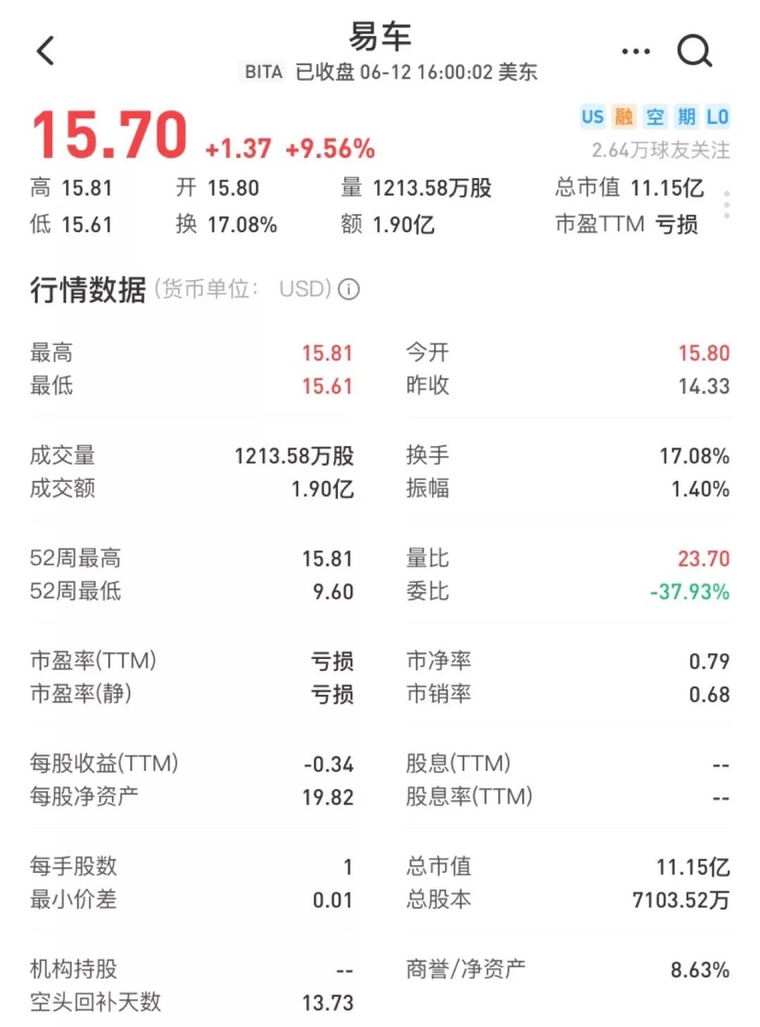 從提出邀約到確定達成,私有化的消息都極大的提升了易車的股價。6月12日公告發出後,易車盤中一度漲超10%,最高漲至15.81美元/股,創2019年4月以來新高。截至當日收盤,易車股價15.70/股,總市值11.15億美元。
