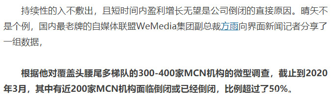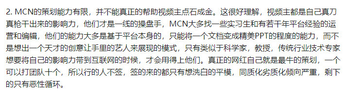 有乾貨的作者,自己信心很足,我一個打你們一團隊,往往不會去籤MCN。於是MCN能簽約到的,往往是沒有乾貨和經驗的新手作者,小白作者,也許有潛力,但他們對於怎麼做內容也一頭霧水,於是和MCN運營大家大眼瞪小眼。很多作者在面對MCN時,我覺得都可以問自己一個問題:你認為,目前最制約你的,是什麼?是有了流量沒有商家客户,還是不知道怎麼做內容做熱點?如果是前者,你可以考慮靠譜的MCN,他們可以幫你解決商業化問題,但如果,是後者那我認為,MCN並無法幫助到你。因為有各種弊端,以及大量水平不一團隊湧入,MCN很快被玩壞。