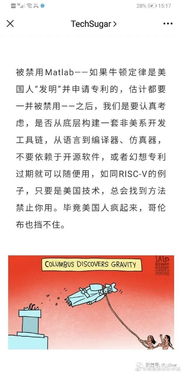 剛剛美國禁止了中國有關軍事的研究單位使用美國的數學工具Matlab,這個對中國的很多研發單位影響是巨大的。中國的各種設計,各種底層運算,還有中國的很多軟件,到了需要計算的部分,其實是在引用這個軟件的,設計好的源代碼也是引用它的。因此沒有了這個軟件,很多事情就趴了。