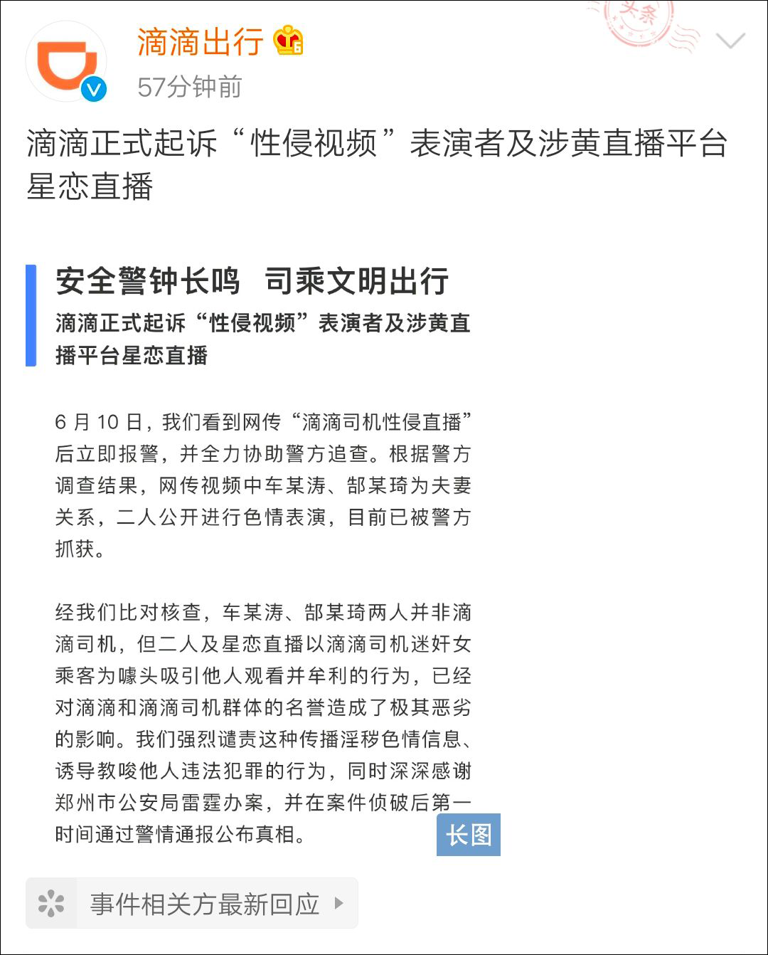 6月15日,@滴滴出行 發佈微博,表示正式起訴“性侵視頻”表演者及涉事直播平台。