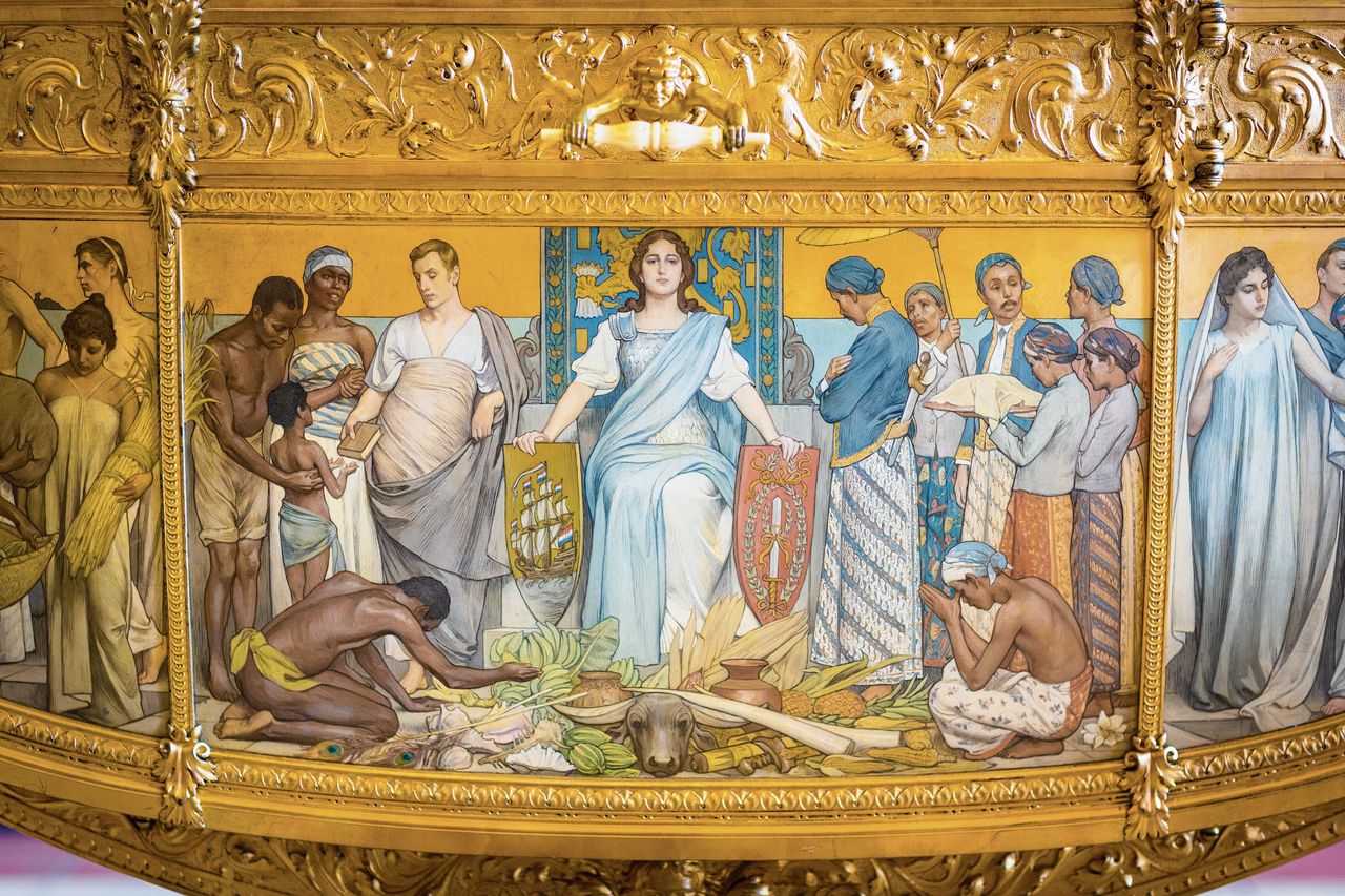 公開資料稱,畫中的半裸人物穿着羅馬長袍,象徵着荷蘭的繁榮。而寶座上的荷蘭女神不是女王,也與王室無關。