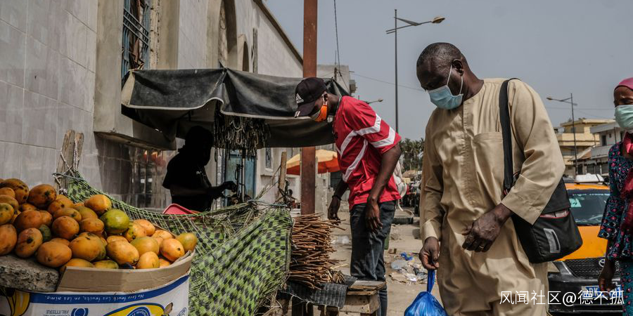 5月12日,在塞內加爾首都達喀爾,一名戴着口罩的顧客在路邊攤購買水果。新華社發(埃迪·彼得斯攝)