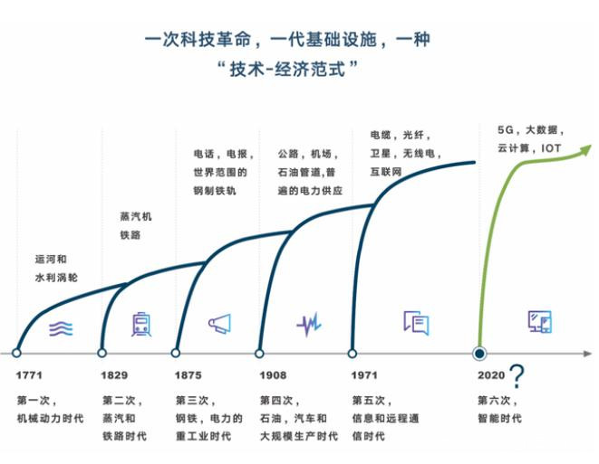 2003 年,英國劍橋大學的著名學者卡洛塔·佩雷斯在其著作《技術革命與金融資本》中將過去兩百多年工業革命的歷史進程分為五個階段,而當前我們即將進入第六個階段: