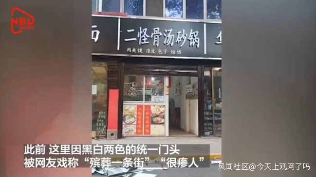 附近商户:(黑白門頭)就是最近改造的,對面商鋪現在全部都是黑的,肯定不好看嘛,説不好聽點就像‘靈堂’。我們做生意的喜歡紅色,紅紅火火嘛,肯定要圖個喜慶,弄個這樣的顏色感覺陰森森的。