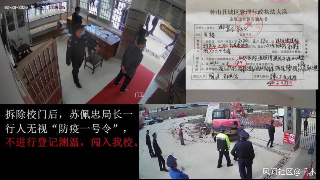 三、通報中“視頻內容實為2020年2月28日集中整治行動中依法對鐘山縣冠豐慧靈學校違章建築進行正常拆除的情形。執法過程中,鐘山縣冠豐慧靈學校法定代表人施漢忠等人進行阻撓。”與事實不符。1. 視頻中第3分55秒,蘇某指向帝景豪園方向,説他是去檢查復工復產情況;2. 視頻中第5分26秒,蘇某打電話給下屬,反覆解釋強拆地點。説明下屬事先並不知道強拆地點;3. 視頻中第8分43秒,蘇某叫來的執法隊員,在其授意下現場填寫《違規違章警告通知書》,説明強拆是蘇某臨時起意、公權私用、挾私報復;4.強拆過程中,我校所有人員一直在其設置的警戒線外,均未出現阻擾行為;
