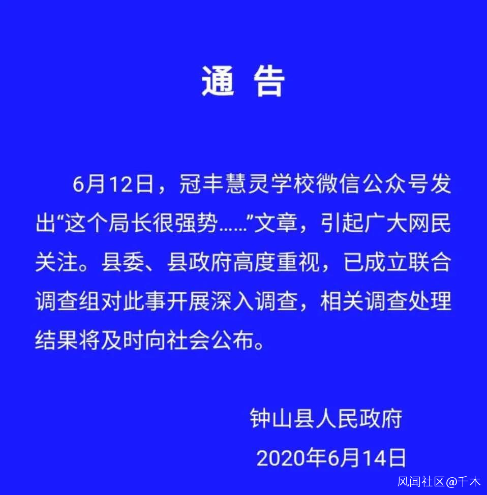 今天6月13日傍晚,鐘山縣發佈了關於“這個局長很強勢”網絡輿情有關情況的通報後。(相關新聞)今日上午,鐘山縣冠豐慧靈學校再度發文回應。今天下午,鐘山縣已成立聯合調查組對此事開展深入調查。