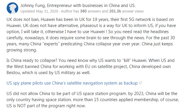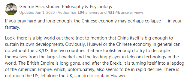看,外面的世界很大(更不用説中國本身就很強大,足以維持自己的發展)。顯然,華為或整個中國經濟都離不開英國和美國,但這兩個國家甚至愚蠢到試圖與全球最大的市場和電信技術領先者脱鈎。大英帝國早已不復存在,在英國脱歐之後,它正把自己變成美利堅帝國的一條走狗,不幸的是,美利堅帝國似乎也在迅速衰落。在遏制華為方面,美國能做的都不多,更別提英國了。