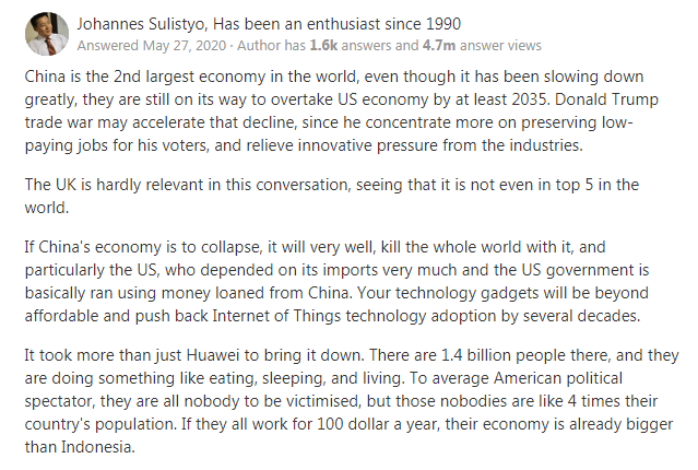 讓中國垮掉不是光有華為就夠了。中國有14億人口,他們每天都做着吃飯、睡覺、生活之類的小事。對於普通的美國政治觀察家來説,他們不過是些會成為犧牲品的無名小卒,但就是這些無名小卒的人數加起來是他們國家總人口的4倍。假如他們每年的工資收入只有100美元,他們的經濟也已經超過了印尼。
