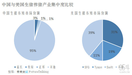 相比美國,早在十年前,生豬養殖產業集中度已經非常給高,最大的四家養豬企業控制了美國70%的豬肉市場。而中國絕大多數市場還是在中小企業手中。”向集中化發展,將成為未來幾年中國養豬產業主旋律。這也意味着競爭越來越激烈,對手越來越強,新進入門檻越來越高。跨界養豬入場難度也將提升,而勝出概率或更低。