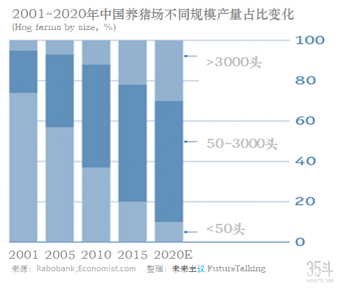 根據相關數據,2003年時,中國70%的豬肉來自於規模小於50頭的小型養豬場,規模達1萬頭以上的超大户僅佔3%的豬肉市場。但經過十幾年的變化,小型養豬場的佔比已大幅下降。2014年起相關減少農村污染的政策出台,減少了數十萬小型豬場,將生豬集中到一個新的設施進行養殖,而同期5萬頭生豬以上的超大户養殖場數量從50個增加到300多個。中小户退出市場,為大户留下巨大市場空間。