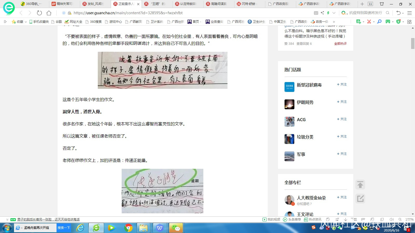 二,高度(自我)暗示性:在沒有更多不利於老師的證據之前,暫時假設並採信老師只是批示了“傳遞正能量”而沒有打罵羞辱行為,而且中文上的紅槓都是學生自己劃掉的話,那麼很可能是“開局一張圖聯想構建出整個世界”這樣的高度(自我)暗示性,也就是常説的想得太多,從“過分誇耀和顯示自已”的舞台中心因為預期受眾的否定瞬間跌落到自我全面否決的深淵,引發不可測的任性和衝動。
