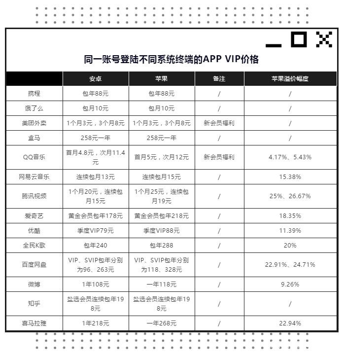 但是,在測評過程中,《IT時報》記者發現仍有攜程、餓了麼、美團外賣、盒馬等App的VIP價格在安卓端和蘋果端相同。這些App主要以實體產品和服務為主。